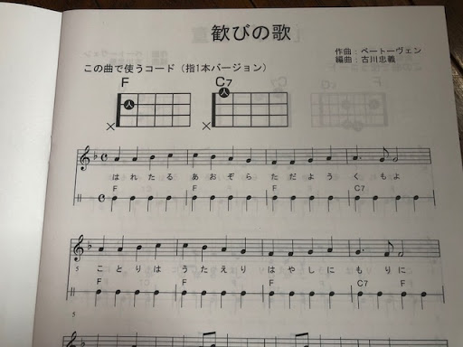 指1本で押さえられるコードを古川先生が、ちゃんと用意してくださっていますので、弾ける喜びを味わえますよ!
