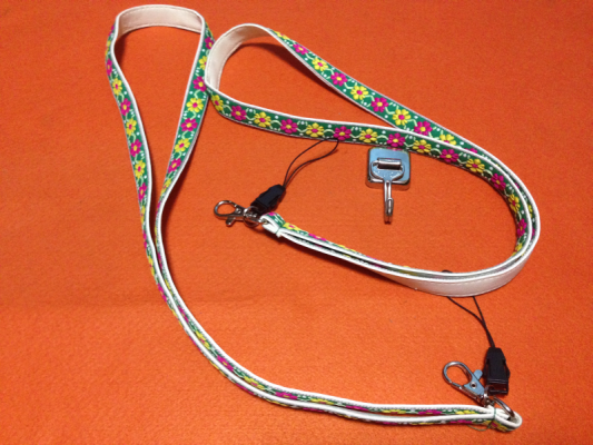 100均ショップで、よく見るカードを首から下げる紐を利用してストラップを作った方です。