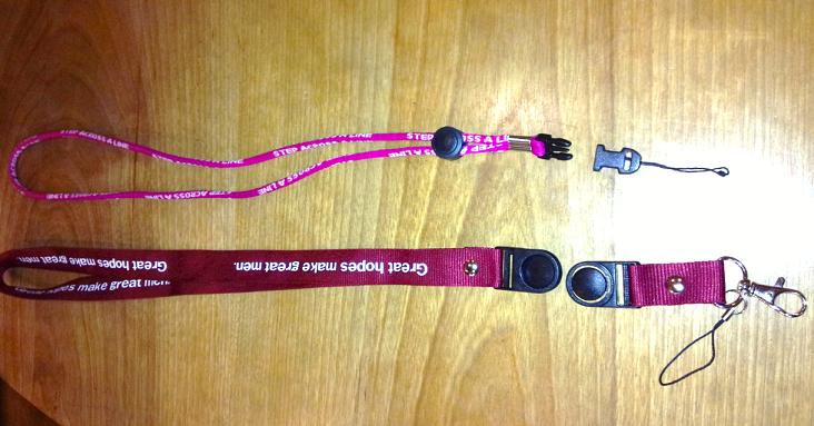 「カードやペットボトルを首から下げるアタッチメント付きの紐で」