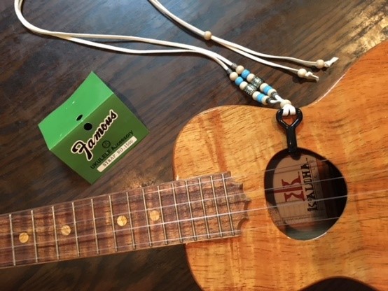 私の場合は、長時間人前で弾くこともないだろうし、自宅の中で、ウクレレを楽しめばいいと思っていますので、ウクレレに穴を開け、金属のストラップピンをつけることはせず、首から下げるタイプのストラップにしました。現状で、満足しています。