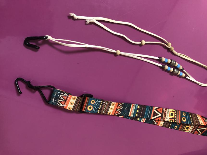 どちらも、ウクレレボディの裏側からサウンドホールにフックを引っ掛け、首にかけて使います。紐が、細くて不安定だったので、幅2.5センチのストラップにしました。安定感は、紐式