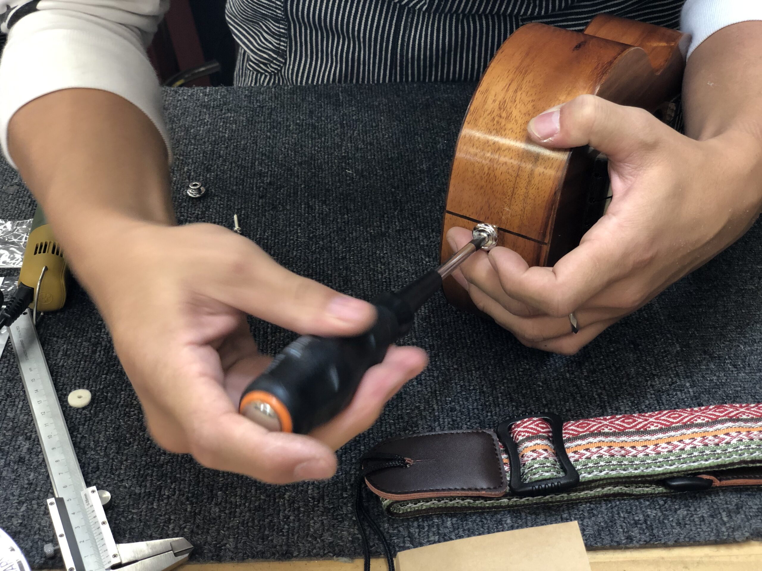 肩掛け式ストラップの加工作業をご紹介します!穴が開く瞬間、ドキドキしましたがつけてウクレレ安定大正解!